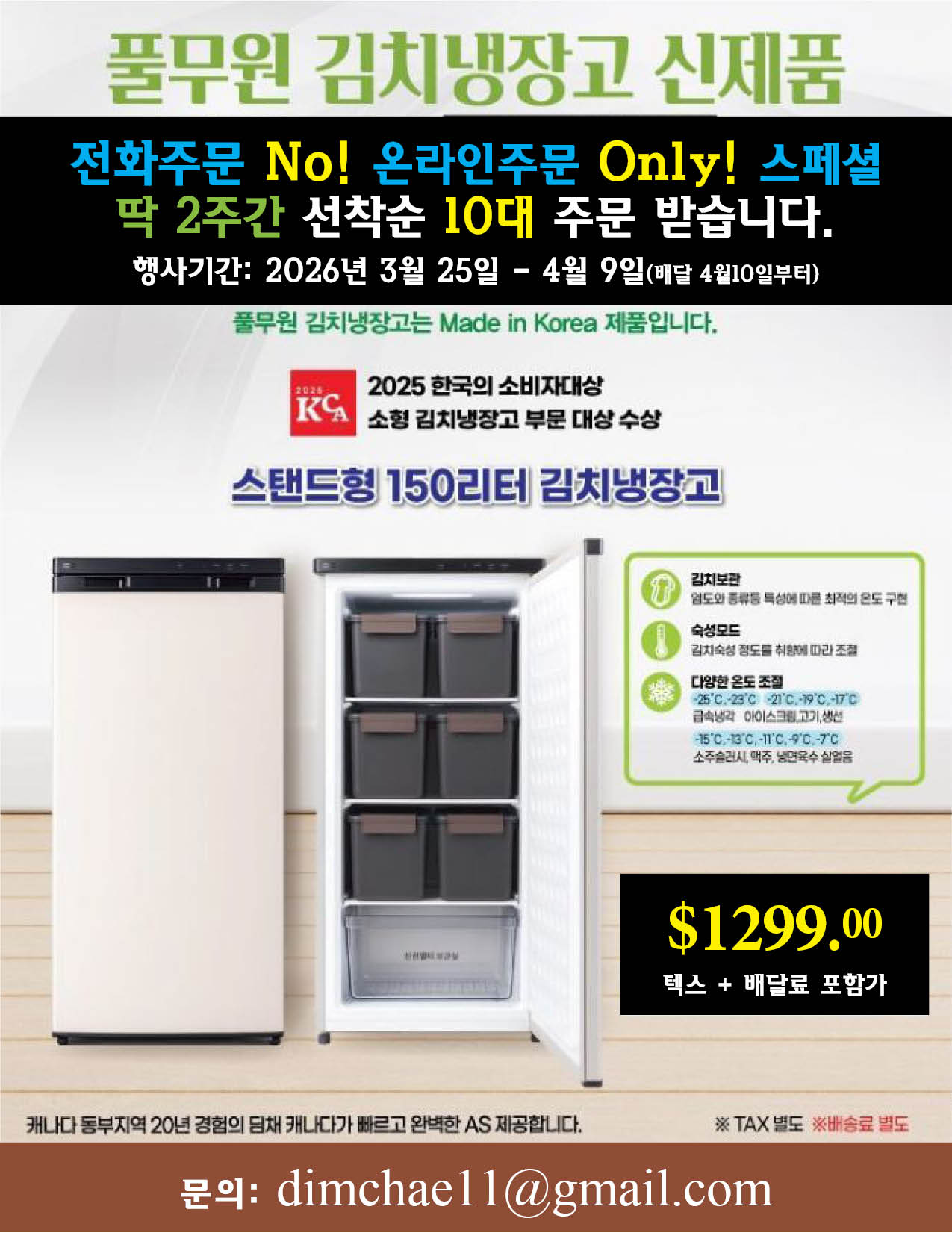 얼이벤트는 딤채 캐나다와 함께 진행한 2024년 신제품 특별 할인 행사가 성황리에 종료 되었습니다. 2024년형 스탠드형 신제품 8대 중 6대가 판매 되었으며 현재 330리터 2대만 남아 있습니다. 특별 감사이벤트로 현재 남아 있는 2대의 경우도 판매가 완료 될때까지 할인가로 공급 하도록 하겠습니다. 제품 구매 및 쇼륨(전시장) 방문은 [email protected] 또는 얼이벤트 웹사이트를 통해 신청 가능합니다.